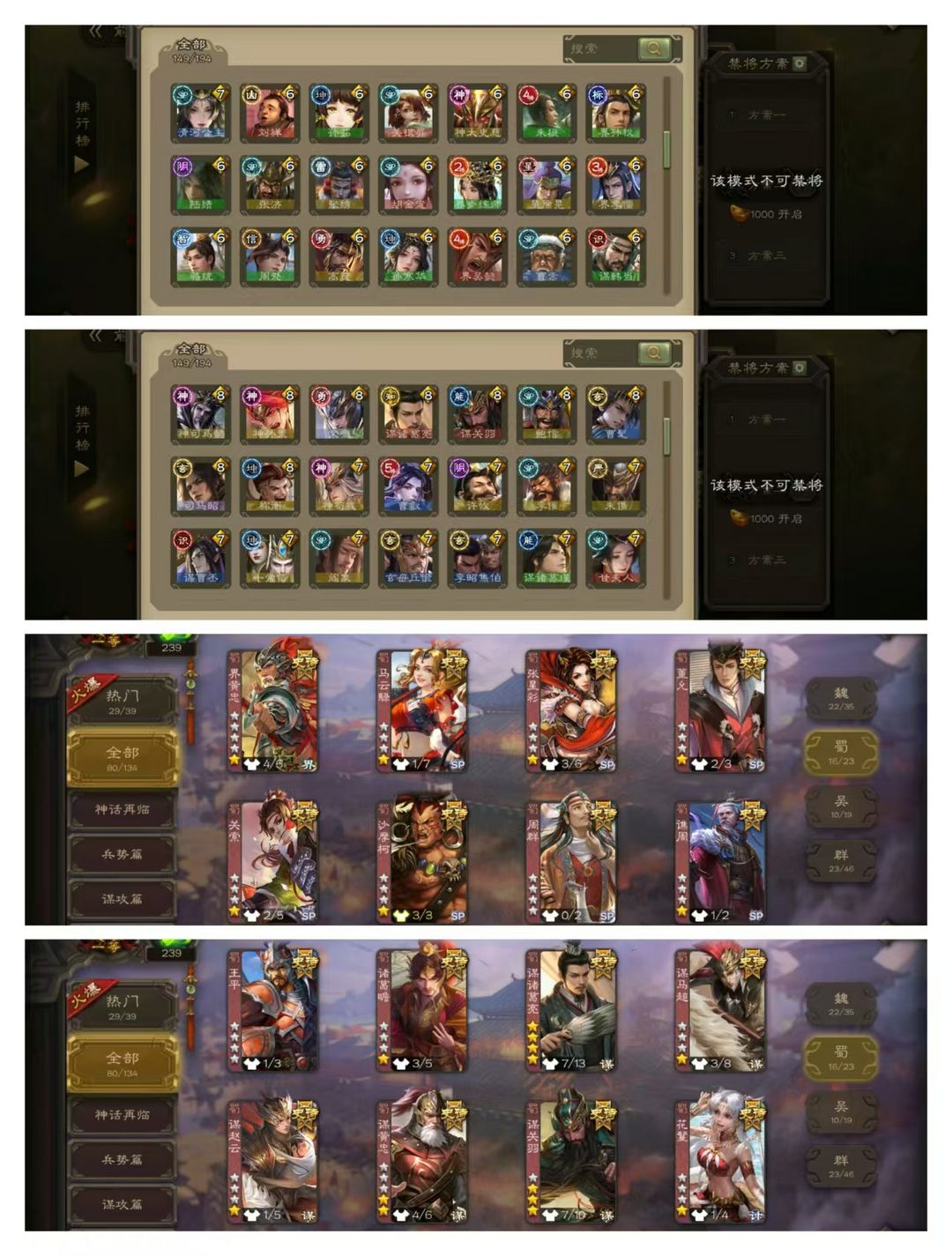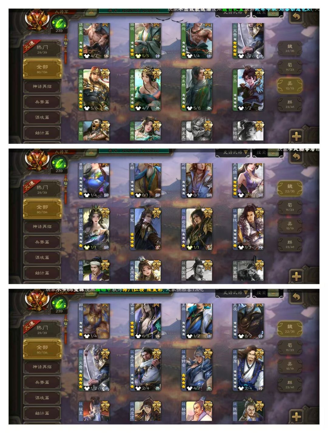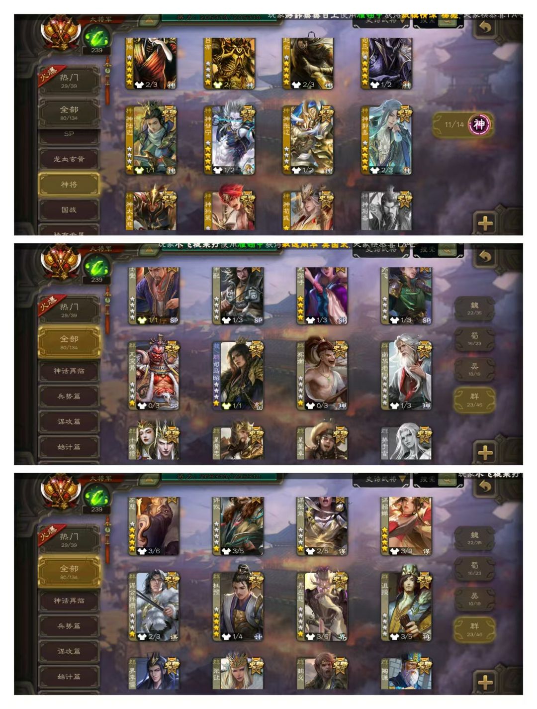 有卡【80史诗一等大将军】双形态动十常侍动神郭嘉*动谋诸葛亮动神司马懿动谋关羽动神孙策*曹髦友徐庶