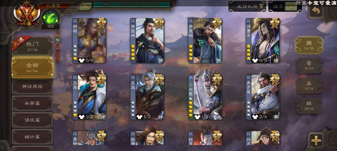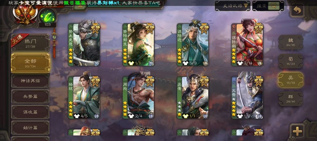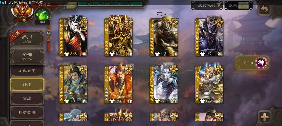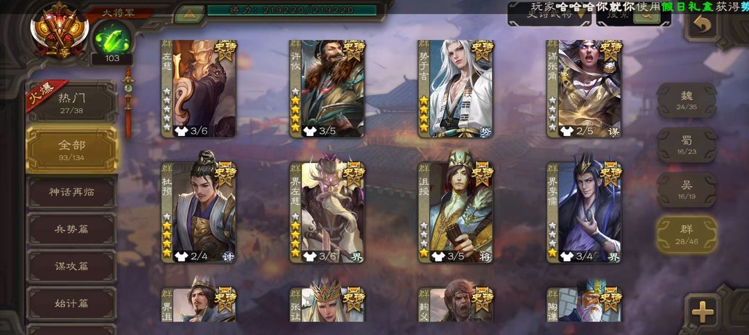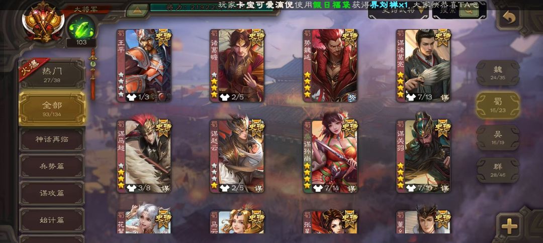 93史诗一等大将军,15w+金豆,海量三卡,到时不顶,新出热门史诗武将、强力天宫武将齐全,动皮多多,